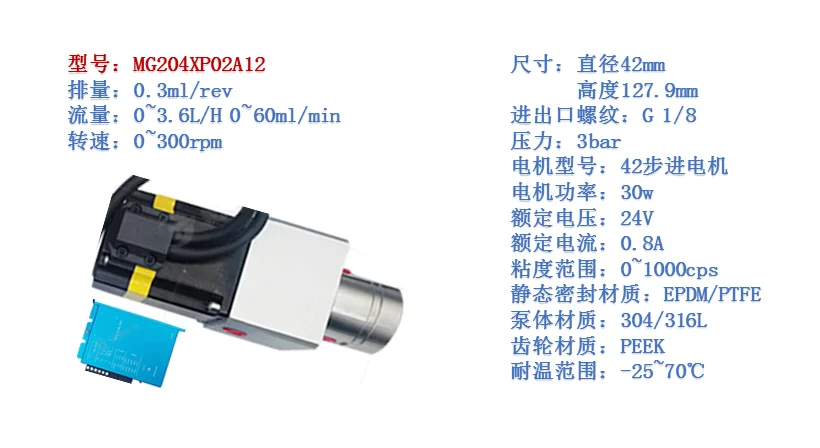 FLOWDRIFTTMDC 24V Liquid Pump Water Pump Electric Stepper Motor Drive Metering Pump Magnetic Drive Gear Pump Low Flow 60mLPM Stainless Steel Gear Pump MG204XP02A12 for fluid -25~70℃ Viscosity 3000CPS high and low temperature resistance accurate measurement no leakage SUS304/316L corrosion resistance lab chemical filling and dispensing instrument